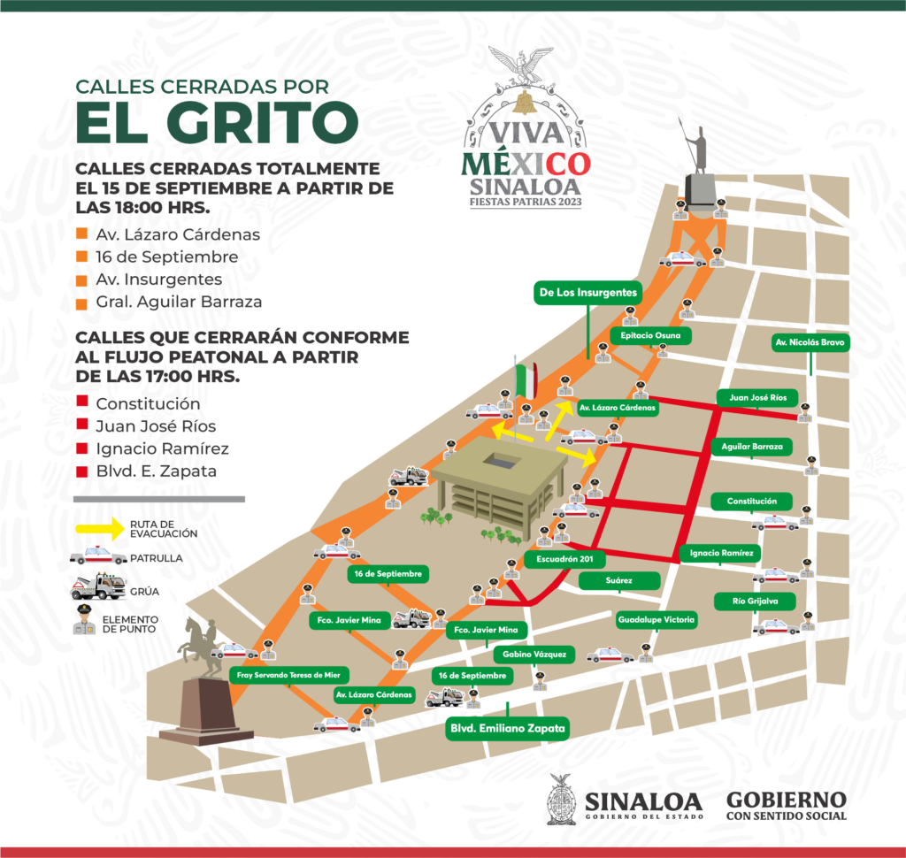 Culiacán, Sinaloa, 14 de septiembre del 2023.- Todo se encuentra listo para la realización de la máxima fiesta de los mexicanos, como es la celebración de la Independencia de México, que cada año se celebra con el tradicional Grito de Independencia por parte del gobernador del estado desde el balcón de Palacio de Gobierno y a la mañana siguiente con el desfile cívico militar por la principal avenida de Culiacán, como es la Álvaro Obregón, donde se congregan también miles de habitantes para presenciar dicho desfile junto con sus familias.